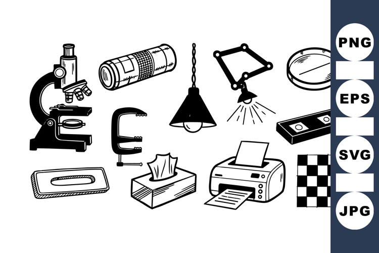 Black White Clipart Vintage Office Clipart Desk Lamp Clipart Office Supplies Bundle Science Lab Illustrations Retro Office Equipment Line Art Office Tools Printer And Microscope Checkerboard Design Set Paper And Stapler Art