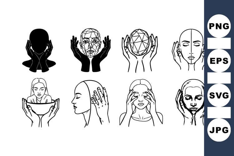 A series of black and white minimal line art illustrations depict a human head held by hands, featuring geometric shapes and abstract styles conveying introspection and care.