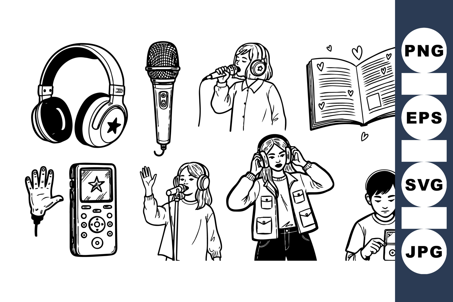 Black and white line art delicate illustration showing children singing, dancing, and listening to music with headphones and microphone, featuring a music book and player, playful and nostalgic.