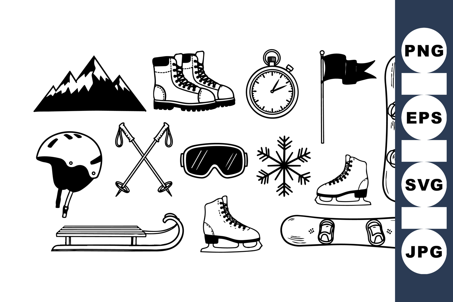 Black and white line art shows a collection of winter sports equipment such as skis, boots, helmet, goggles, and snowboard icons in a clean graphic style.