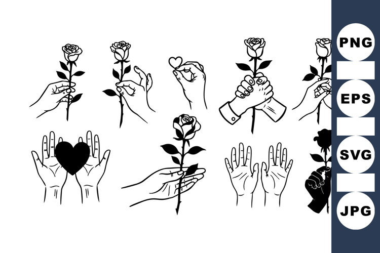 Minimalist line art showing hands holding roses, hearts, and making symbolic gestures in black and white style, suitable for tattoo designs, logos, or editorial use, simple and elegant.