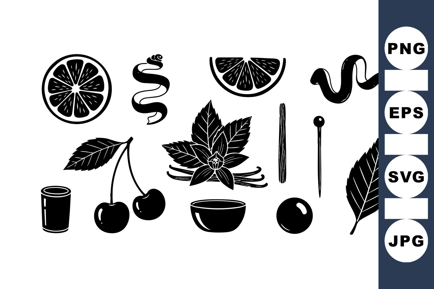 A black and white flat design composition featuring spice and fruit elements such as citrus slices, cherries, cinnamon sticks, and leaves in minimalist style.