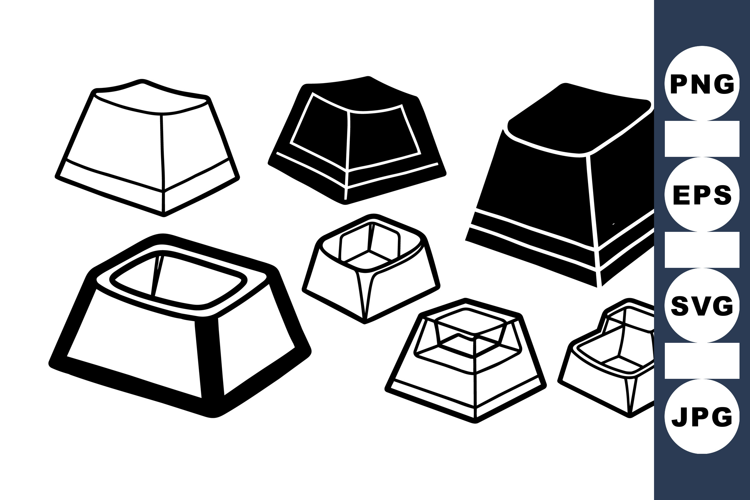 Collection of black and white keyboard keycap illustrations shown from different perspectives in simple line art style for design and icon use, minimalistic and clear.