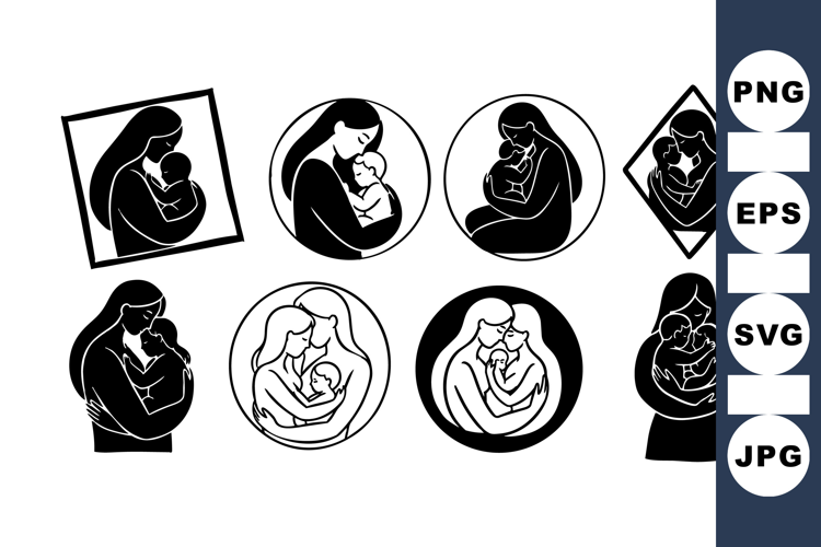 A flat design icon collection depicts mothers cradling infants in monochrome badges, used for maternal logos, apps, and healthcare branding, tender.