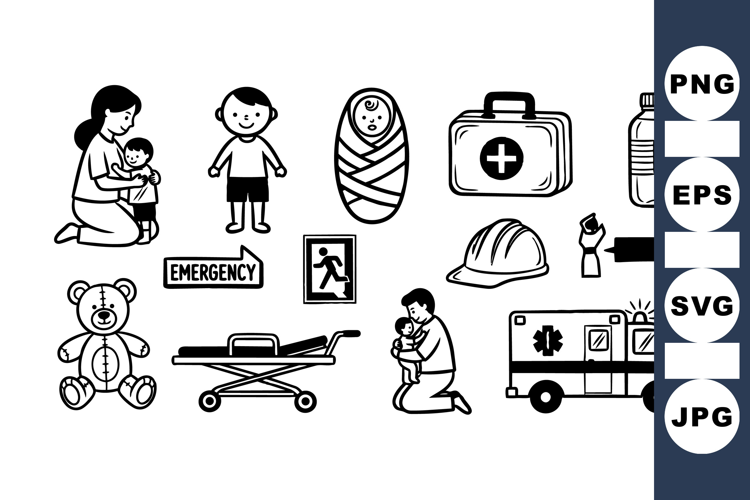First Aid Illustration Doctor Nurse Graphics Emergency Medical Clipart Healthcare Worker Icons Ambulance Vehicle Set Paramedic Emergency Kit Hospital Patient Clipart Baby Care Images Medical Staff Icons Health Safety Signs