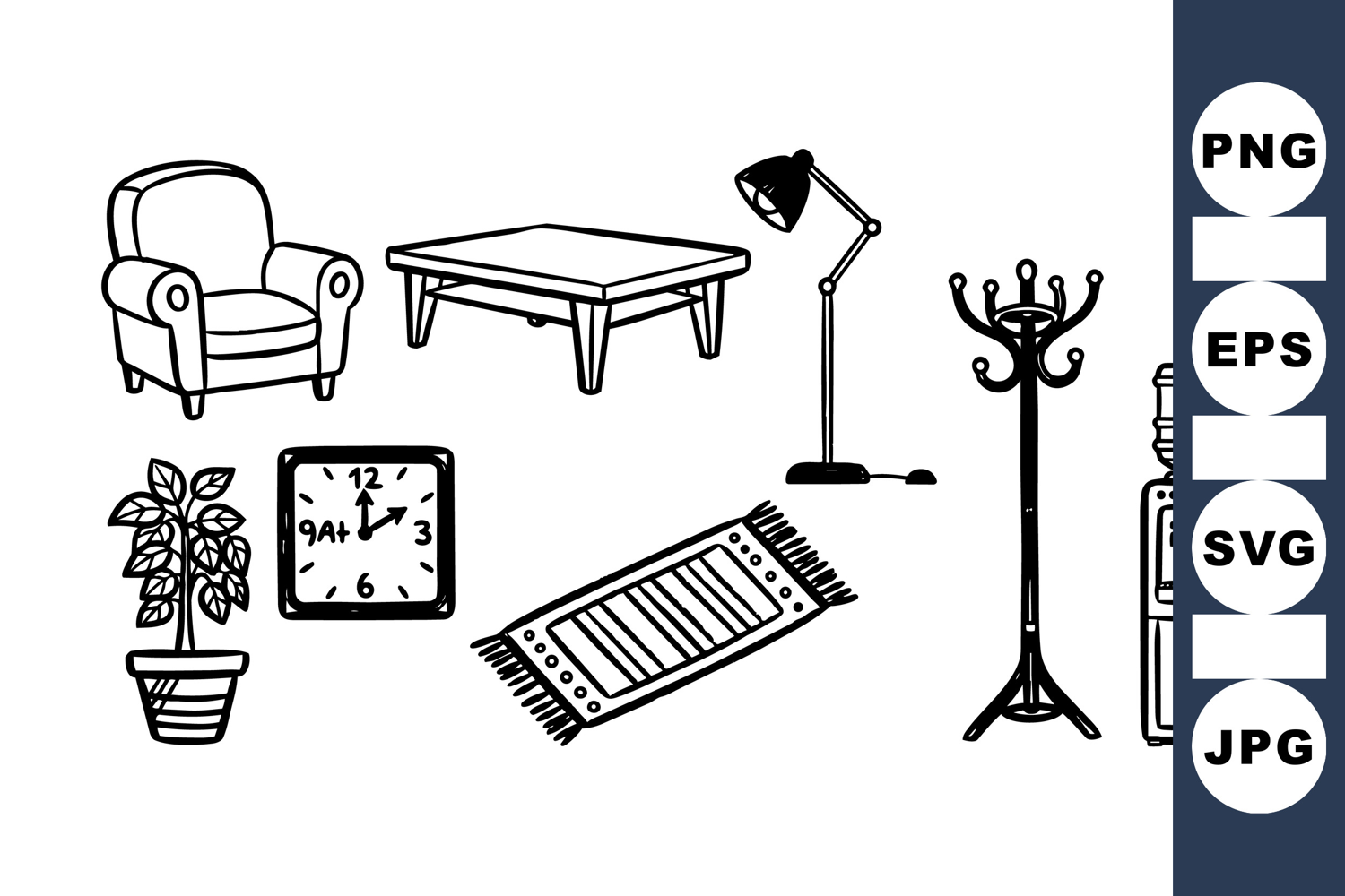 Line Art Clipart Home Decoration Bundle Decorative Plant Clipart Black White Illustration Vintage Home Clipart Hand Drawn Furniture Retro Decor Clipart Living Room Art Set Clock And Lamp Set Coat Rack Illustration