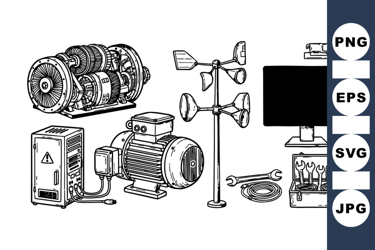 Intricate black and white line illustration shows various industrial machinery parts, including motor, generator, control panel, and wind anemometer, with precise technical detail.