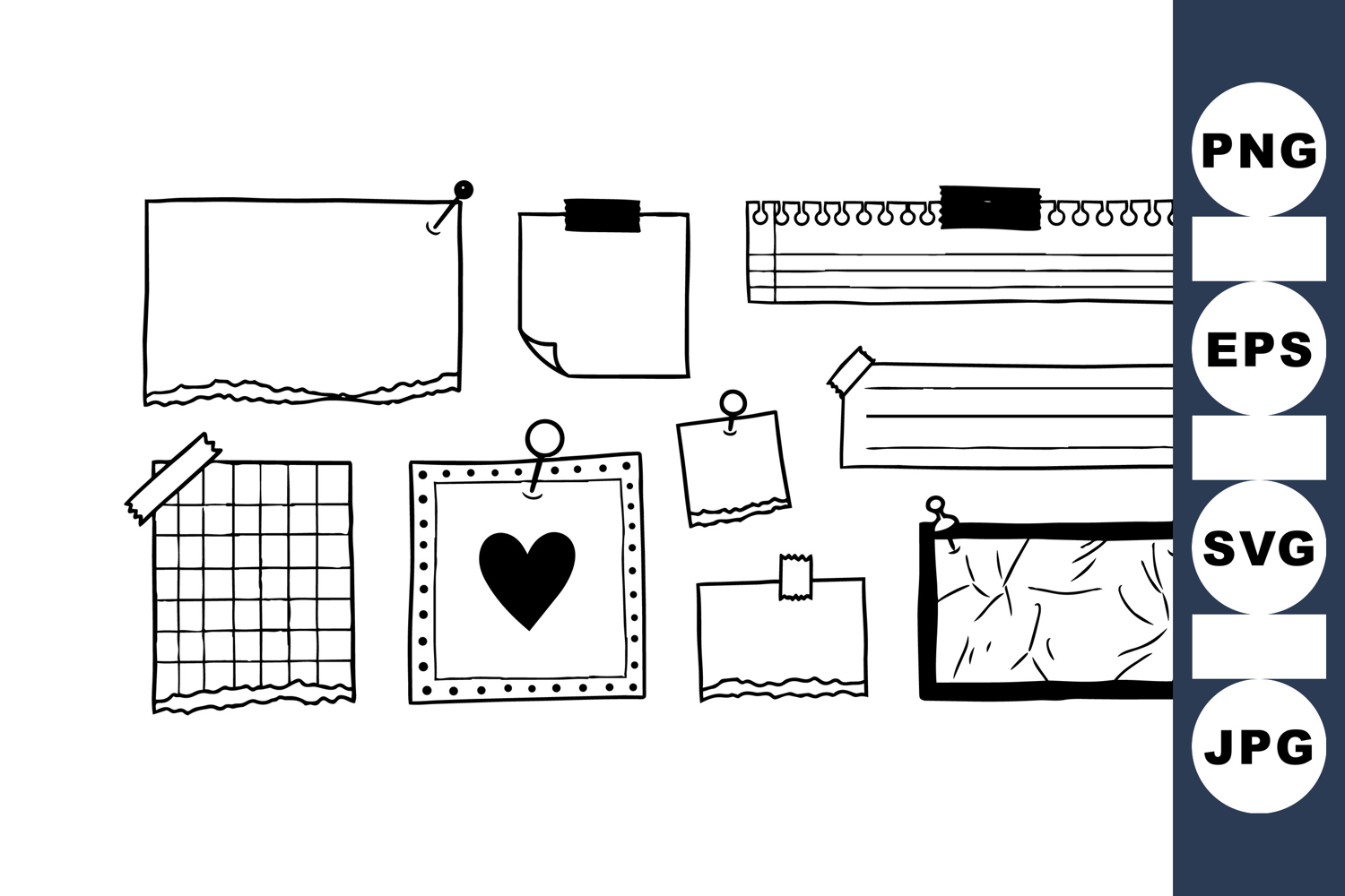 Hand drawn black and white sticky notes and pins including heart shape and grid pattern in doodle style for sketchbook or creative projects, simple and playful mood