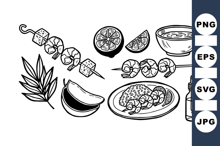 Hand Drawn Clipart Black And White Art Exotic Fruit Clipart Vector Food Collection Cooking Ingredient Clipart Tropical Food Set Summer Meal Illustrations Grilled Shrimp Sketch Barbecue Food Bundle Island Cuisine Graphics