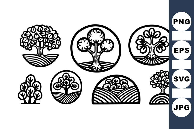 Detailed black and white illustrations of circular tree icons featuring different styles of branches and leaves, perfect for branding or graphic design projects.