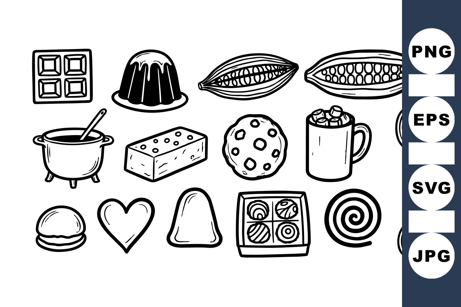 A collection of black and white line art depicting assorted chocolate bars, sweets, a mug, and candy shapes in a whimsical graphic style suitable for branding and packaging.