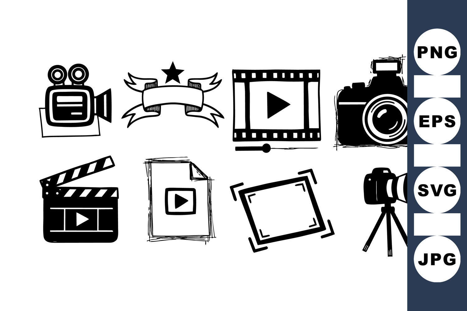 A hand drawn ink icon set depicts film cameras, clapperboards and frames for social media, web headers and branding, playful.