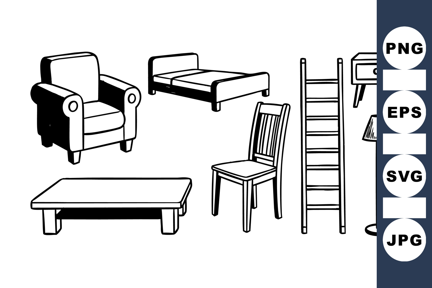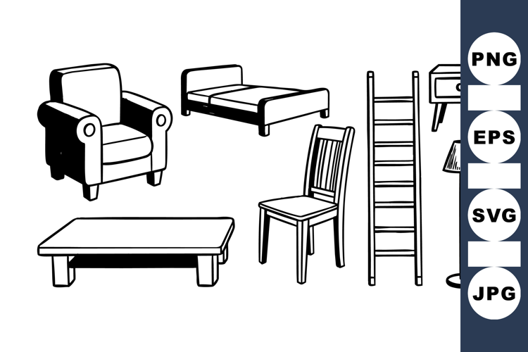 Simple black and white line drawings depict a collection of household furniture including a chair, ladder, bed, armchair, lamp, and tables with minimalistic style, clean and basic.
