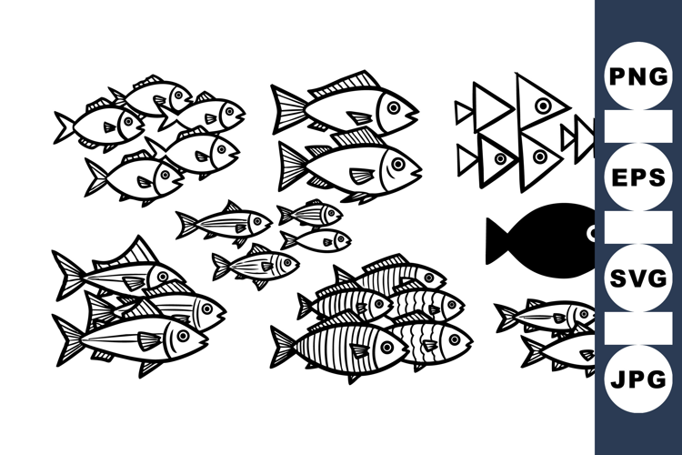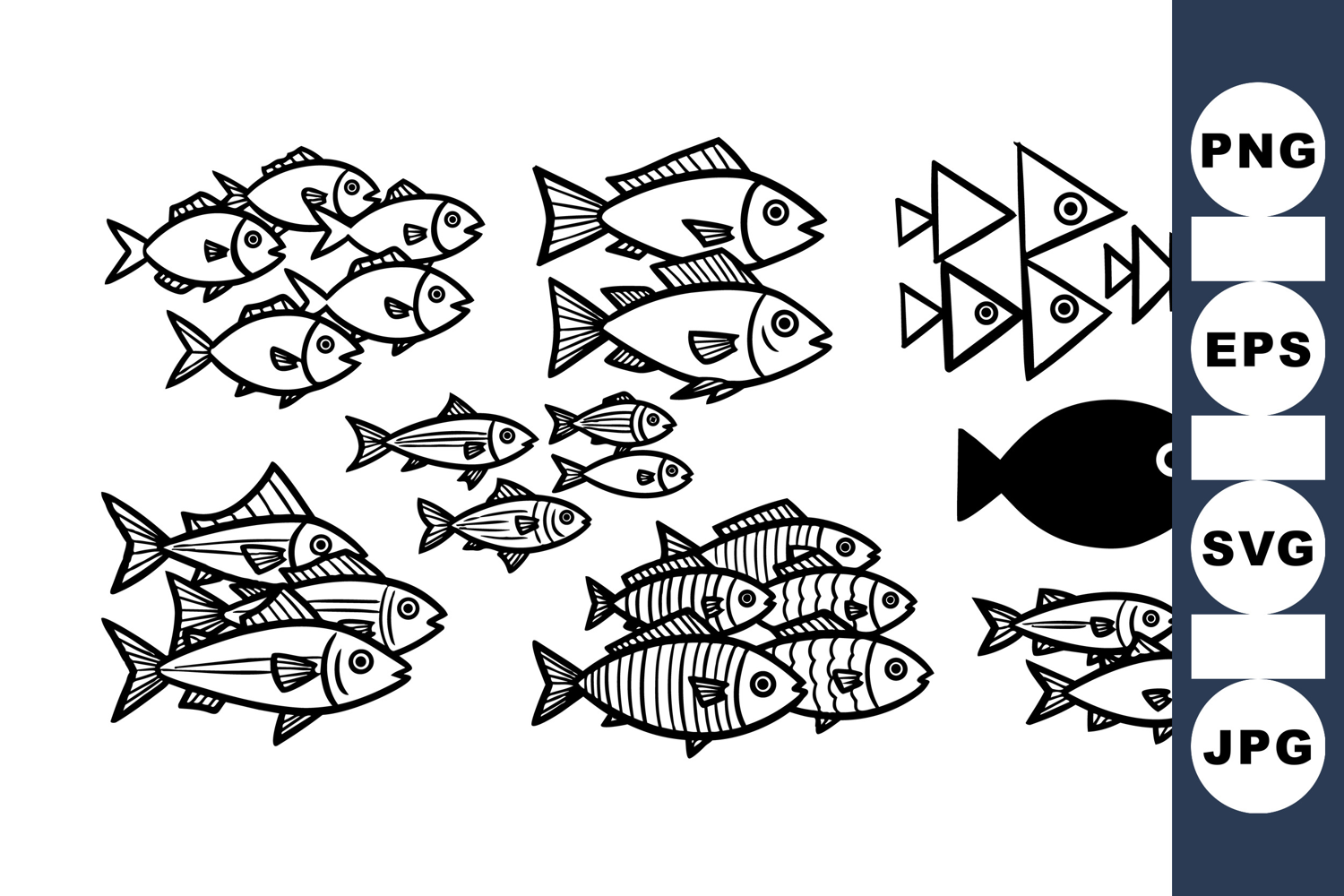 Collection of black and white fish silhouettes in various sizes and swimming directions, presented in a clean line art style for eco or marine design projects.