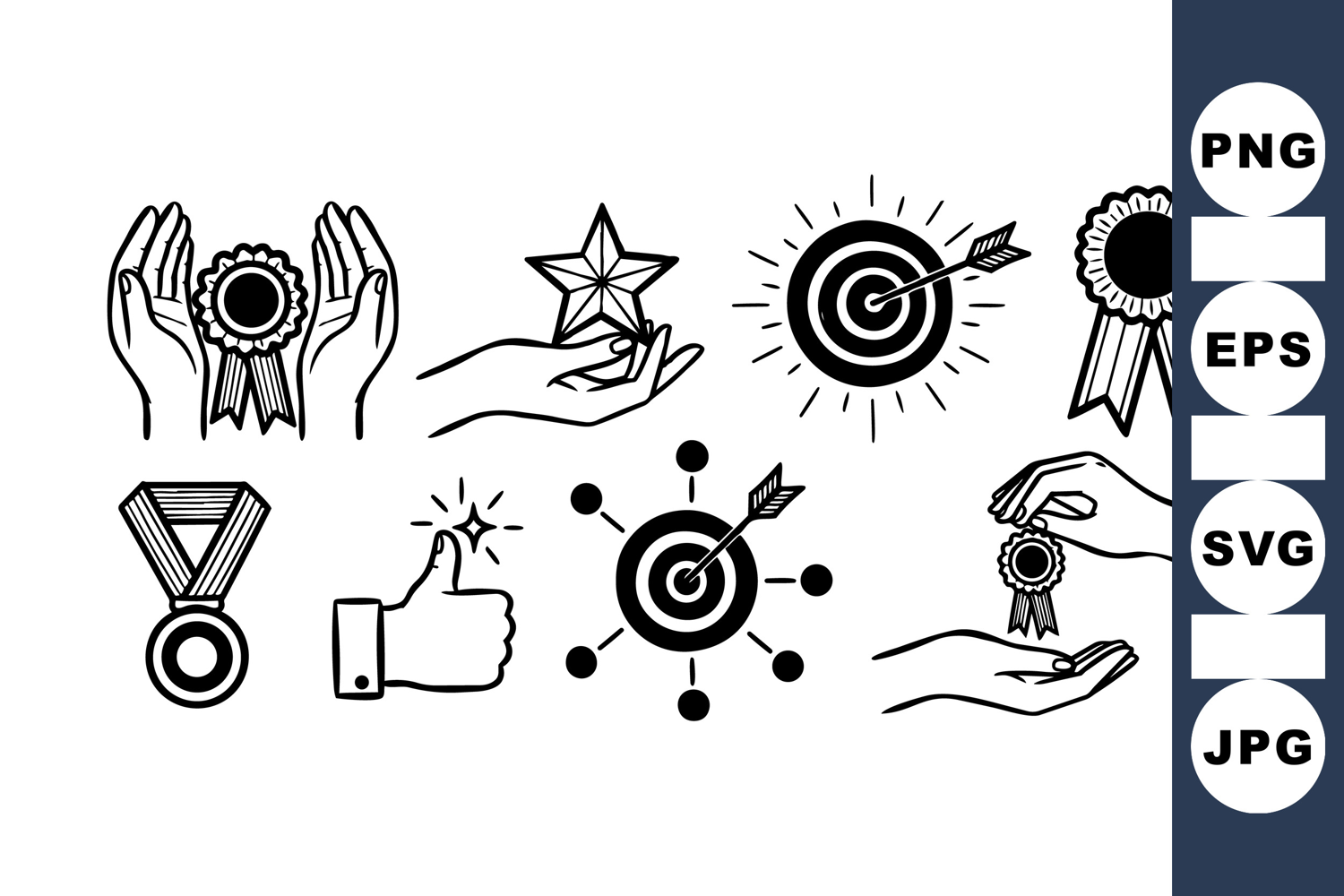 Simple black and white line art features hands holding awards, stars, and target arrows, suitable for motivational or achievement themed designs with a clean style.