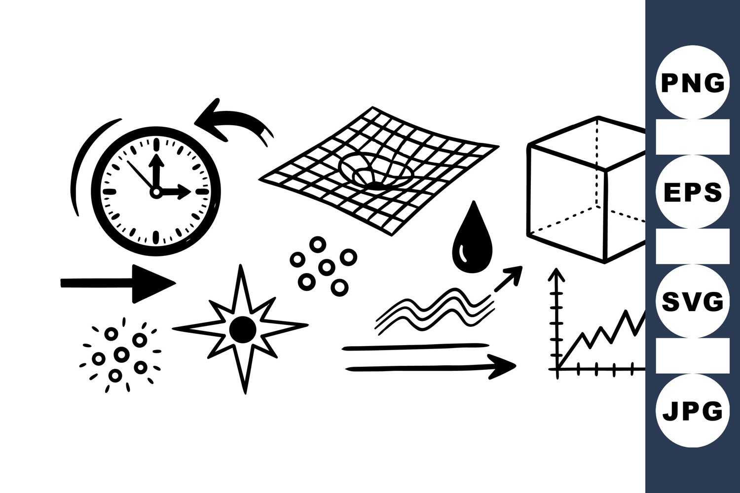 Simple black and white line art displaying various scientific symbols including clock, cube, graph, and water droplet in abstract arrangement.