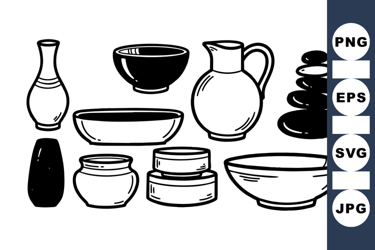 A monochrome graphic illustration shows different cosmetic containers such as jars, bowls, pitchers, and spa stones, emphasizing minimalistic line art design for branding or packaging.