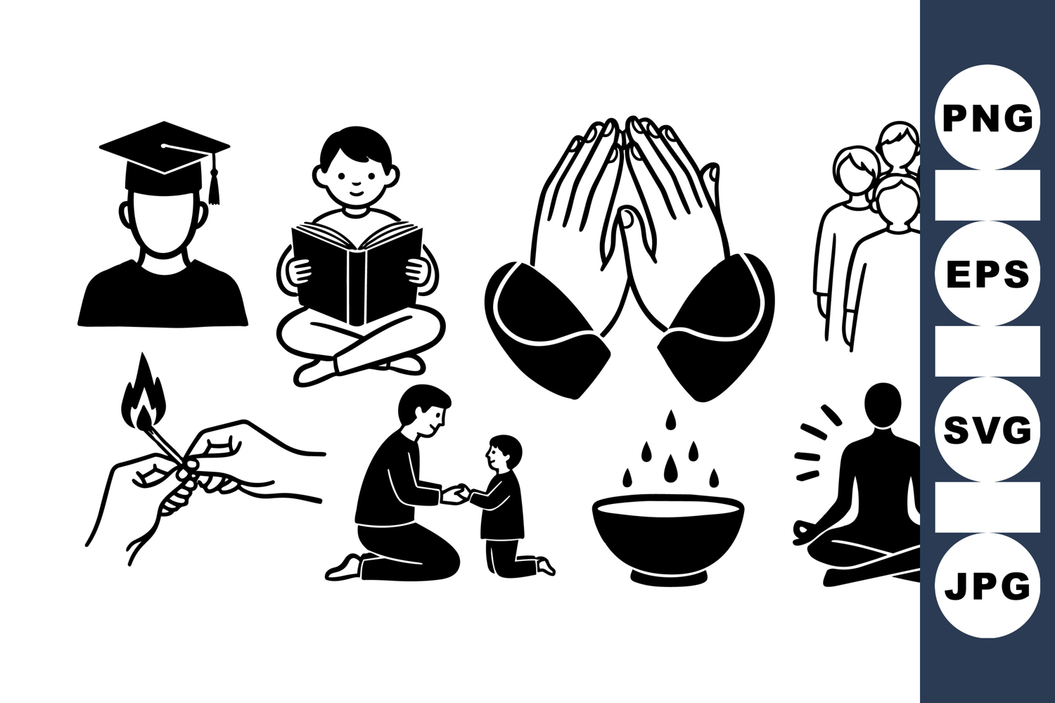 Collection of minimal black icons including graduate, child reading book, praying hands, family, lighting match, parent with child, steaming bowl, and meditating person silhouette in vector style