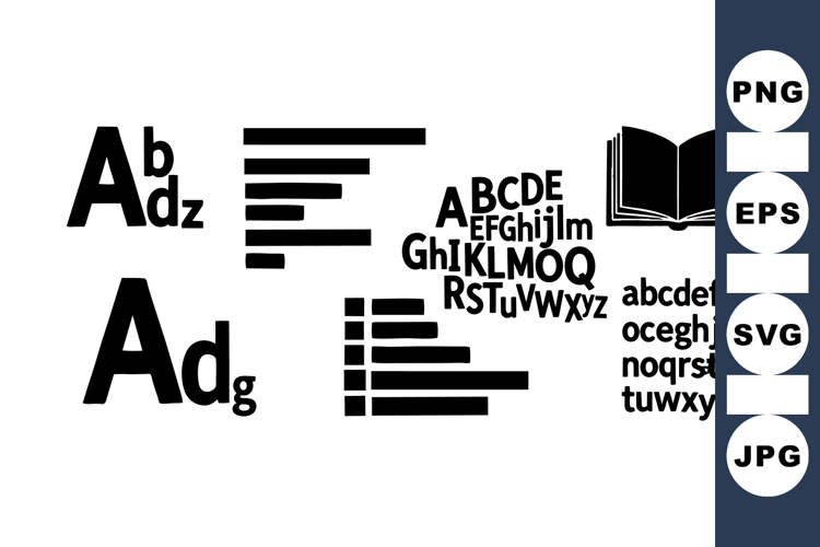 Graphic flat design featuring black typography samples in uppercase and lowercase with a book icon, showing fonts in a clean arrangement and minimalistic style.