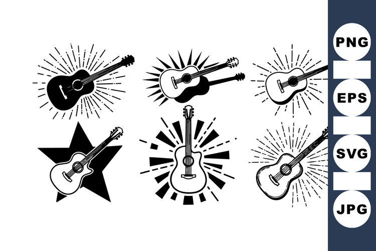 A bold black and white graphic design featuring six acoustic guitar logos with starbursts and dynamic shapes, suitable for music branding and merchandise, edgy style.