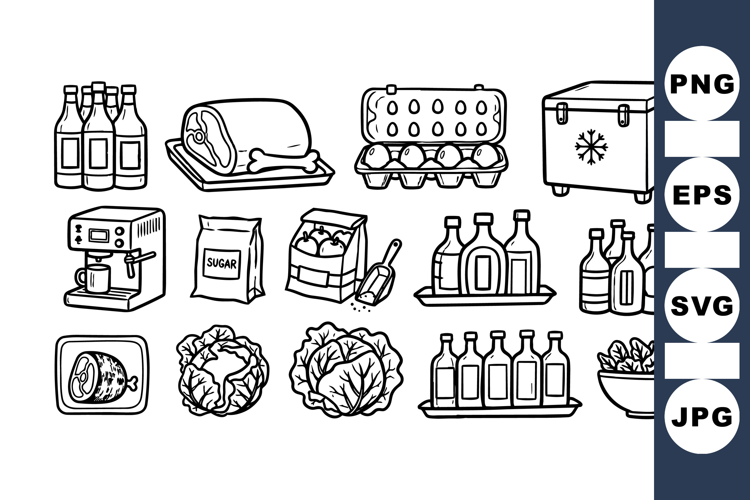 Line art illustration displaying various grocery items such as a coffee machine, eggs, frozen food box, cabbages, and bottles in black and white style suitable for print and web.