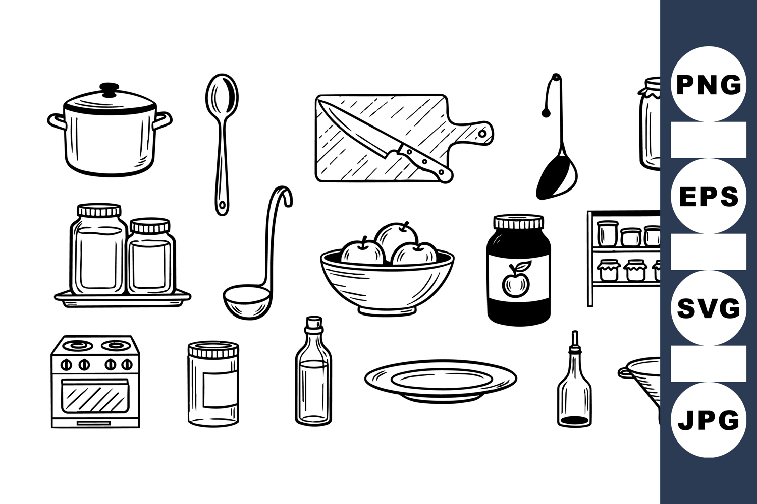 A collection of hand drawn kitchen utensils and containers including pots, ladles, jars, bowls, and bottles displayed in black and white line art style, suitable for culinary design projects and kitchen decor illustrations, minimalistic and clear.