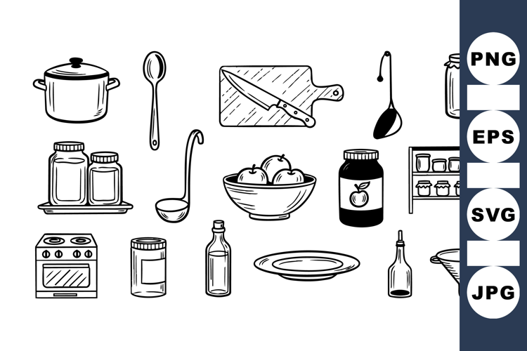 Hand Drawn Kitchen Kitchenware Illustration Black White Kitchen Kitchen Tools Bundle Food Prep Graphics Retro Cooking Set Vintage Pantry Clipart Vintage Utensils Clipart Cooking Utensils Pack Line Art Kitchen Art