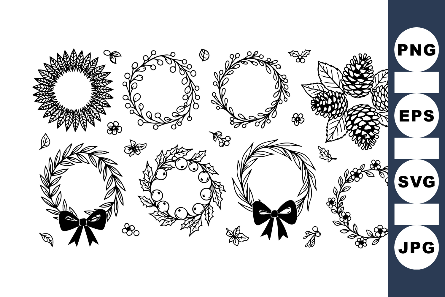 Delicate black and white floral wreaths feature pine cones, bees, and bows in line art style, suitable for invitations, logos, and seasonal decoration, elegant