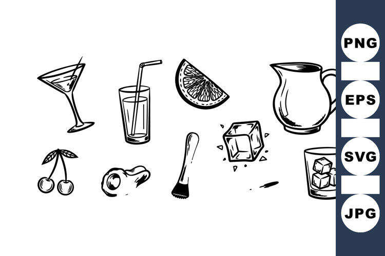 A collection of hand drawn black and white beverage icons including cocktail glasses, fruit slice, ice cube, and mixer tools, designed in simple sketch style.