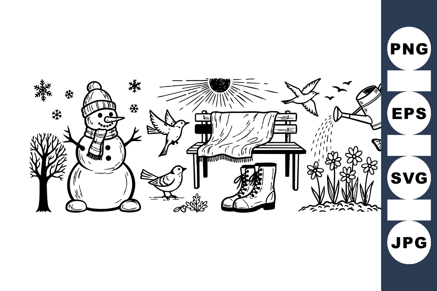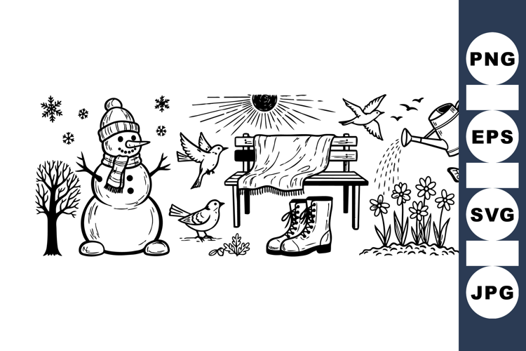 Snowflake Line Art Cute Winter Animals Spring Flower Bundle Winter Snowman Clipart Holiday Season Graphics Black White Sketch Garden Floral Illustrations Hand Drawn Winter Set Rustic Winter Elements Seasonal Garden Clipart