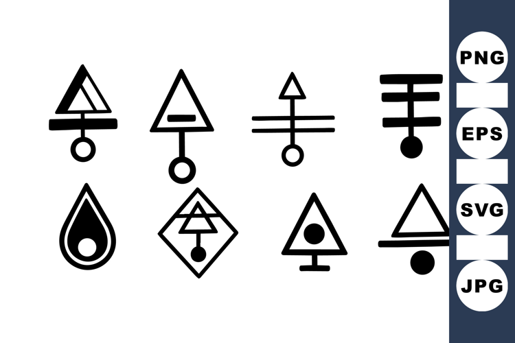 Monochrome flat icons depict eight geometric glyphs reminiscent of alchemical symbols, suited for logos, iconography, and printed signage, minimalist.