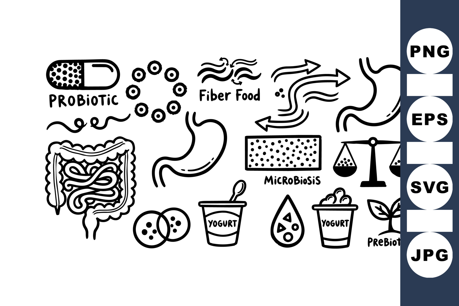 Digestive System Clipart Prebiotic Icon Set Gut Health Icons Fiber Food Graphics Hand Drawn Microbiome Probiotic Illustration Intestinal Flora Design Microbial Balance Art Gut Bacteria Bundle Nutrition Health Set