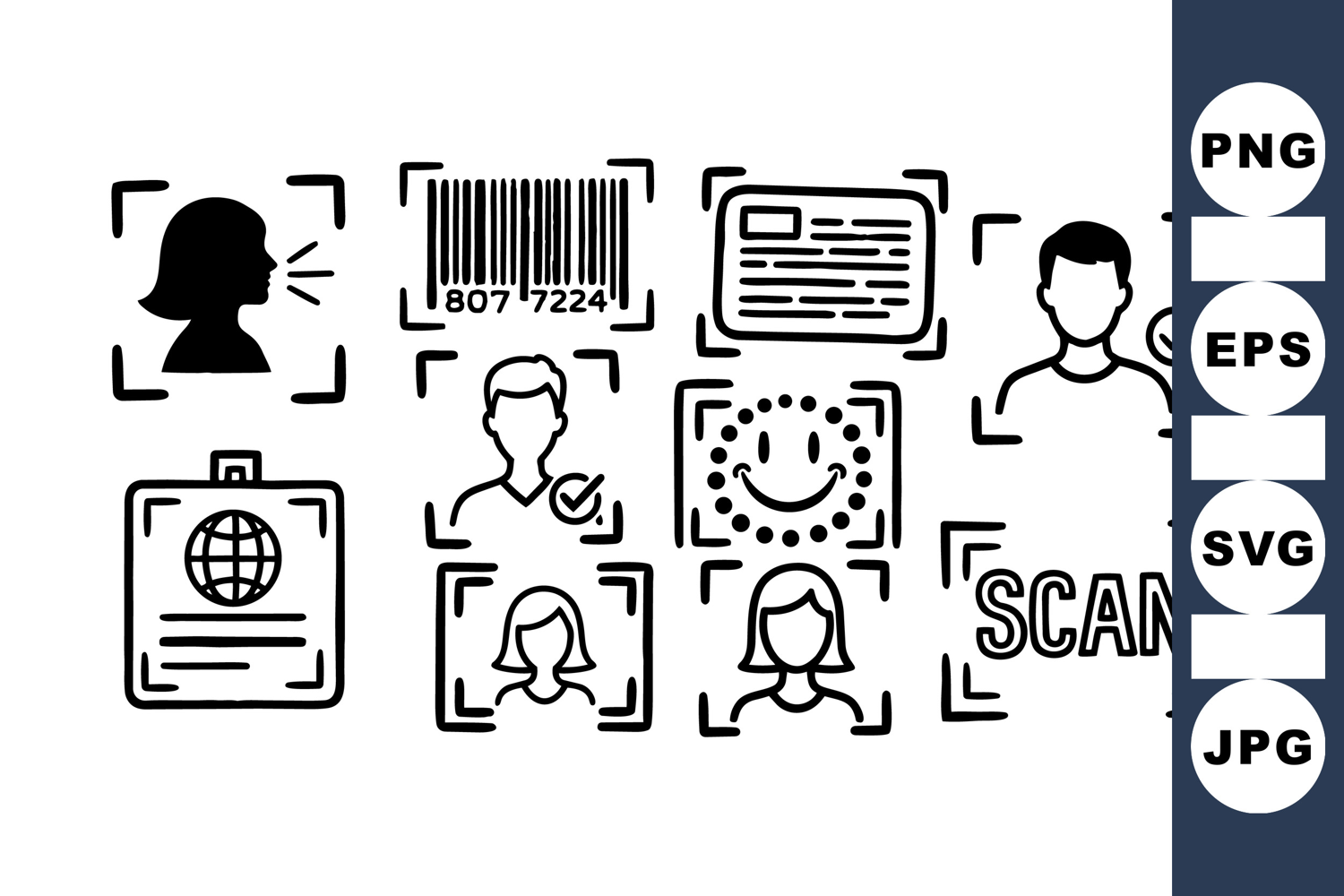Black and white flat design icons depict facial recognition, barcode scanning, and global identification concepts for technology and security systems, clear and minimalistic style.