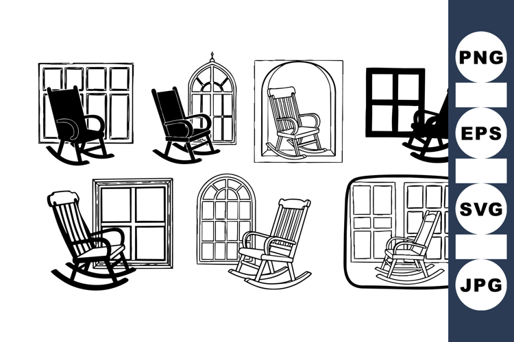 Collection of black line art rocking chairs combined with different window frames showcasing vintage hand drawn illustration style for decorative use
