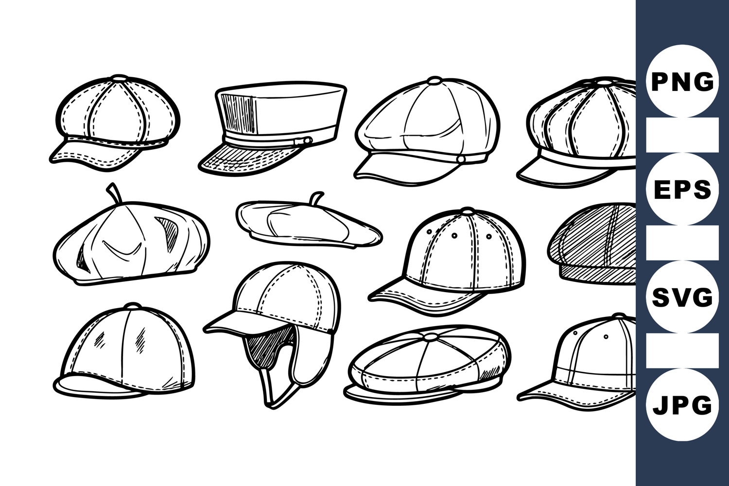 A detailed collection of black and white line art illustrations featuring different cap styles such as baseball, trucker, flat, and visor caps for design use.