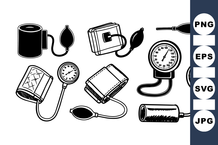 Detailed black and white line art showing multiple types of sphygmomanometers, including manual and aneroid styles, useful for medical educational materials.