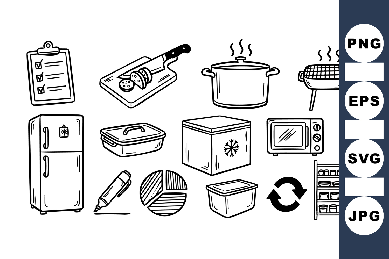 A collection of black and white line art icons including fridge, cutting board, pot, grill, microwave, and recycling symbol in simple outline style for kitchen concepts.