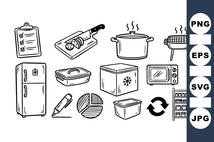Meal Prep Clipart Hand Drawn Kitchen Kitchenware Illustration Kitchen Appliance Clipart Cooking Utensil Set Black And White Kitchen Recipe Clipart Bundle Food Container Graphics Kitchen Cooking Icons Home Cooking Set
