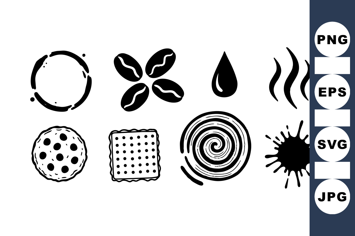 Collection of black coffee related line art featuring stains, beans, drops, steam waves, spots, and spiral designs suitable for graphic projects