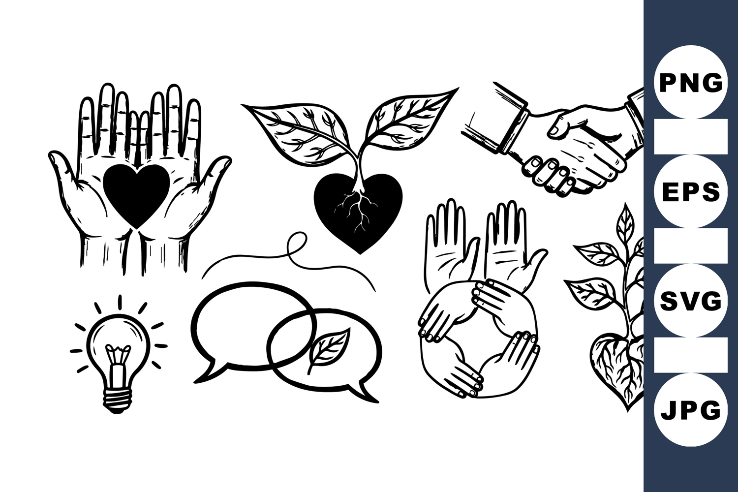 Line art illustration featuring symbolic hands holding hearts and plants, handshake, speech bubbles, and a light bulb, conveying growth and unity, simple style.
