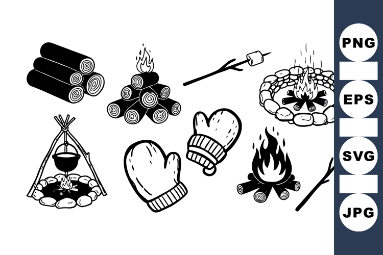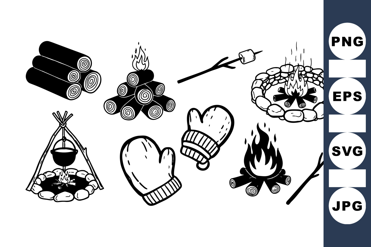 Simple black and white camping illustrations display gloves, marshmallows on sticks, campfire, wood logs, and a kettle with ring fire in cartoon style, rustic vibe.