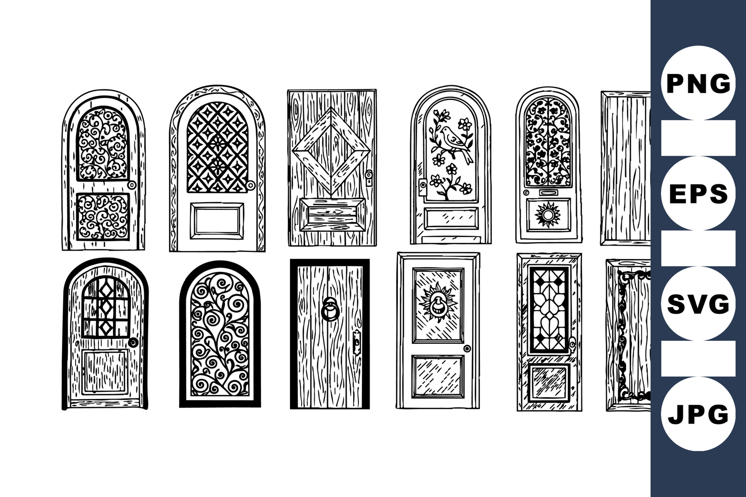 Collection of hand drawn vintage wooden doors showcasing diverse ornate patterns and intricate decorations in black and white line art style, elegant and classic.