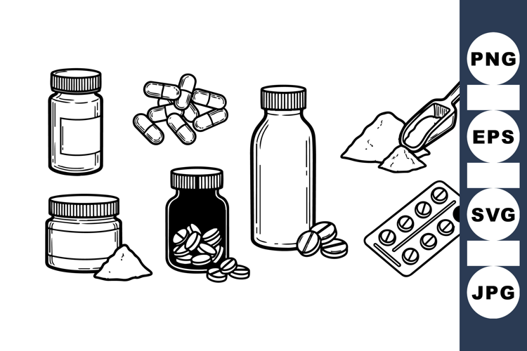 Pill Bottle Clipart Medicine Clipart Bundle Black White Sketches Hand Drawn Pharmacy Vintage Medical Illustrations Pharmacy Supplies Graphics Prescription Label Art Healthcare Craft Elements Apothecary Jar Set Medical Project Graphics