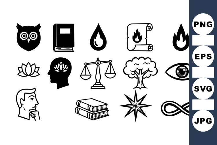 A collection of black silhouette icons featuring an owl, book, fire, droplet, scales, tree, lotus flower, eye, head profile, stacked books, starburst, and infinity symbol