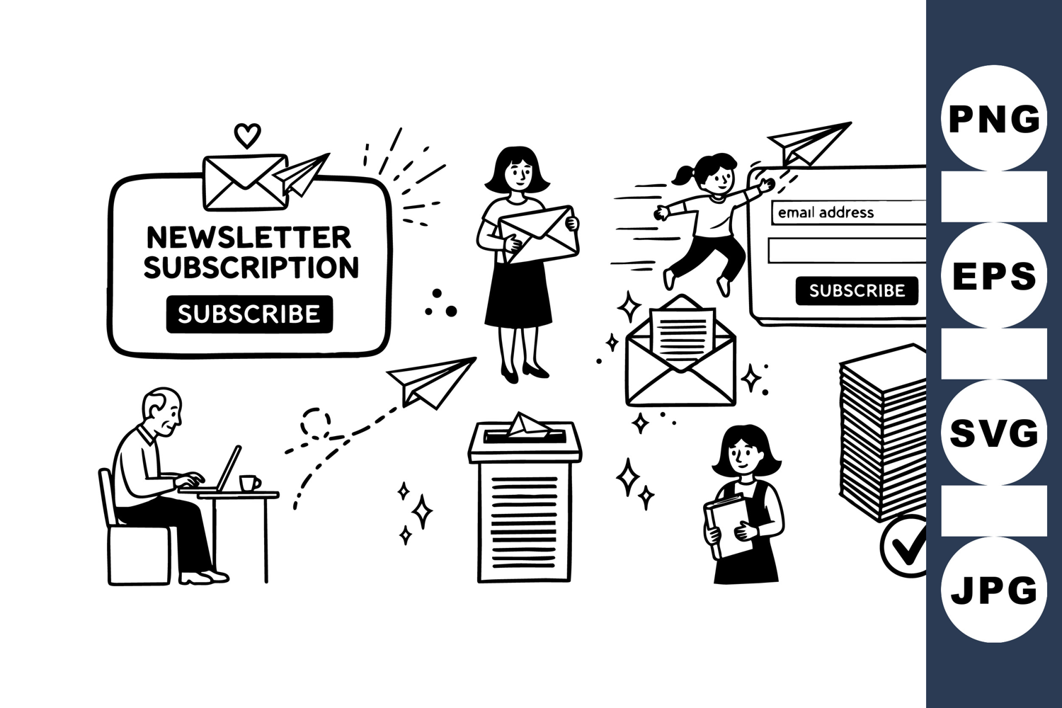Minimalistic black and white line art depicts business professionals sending newsletter subscription emails using paper planes and digital elements, conveying communication and marketing.