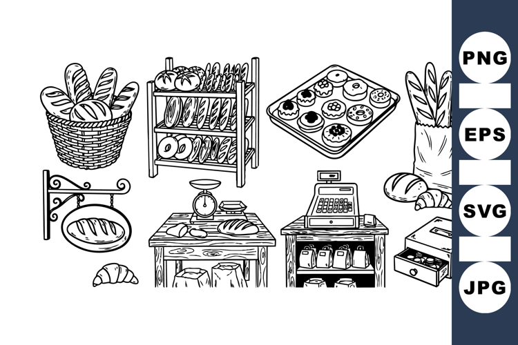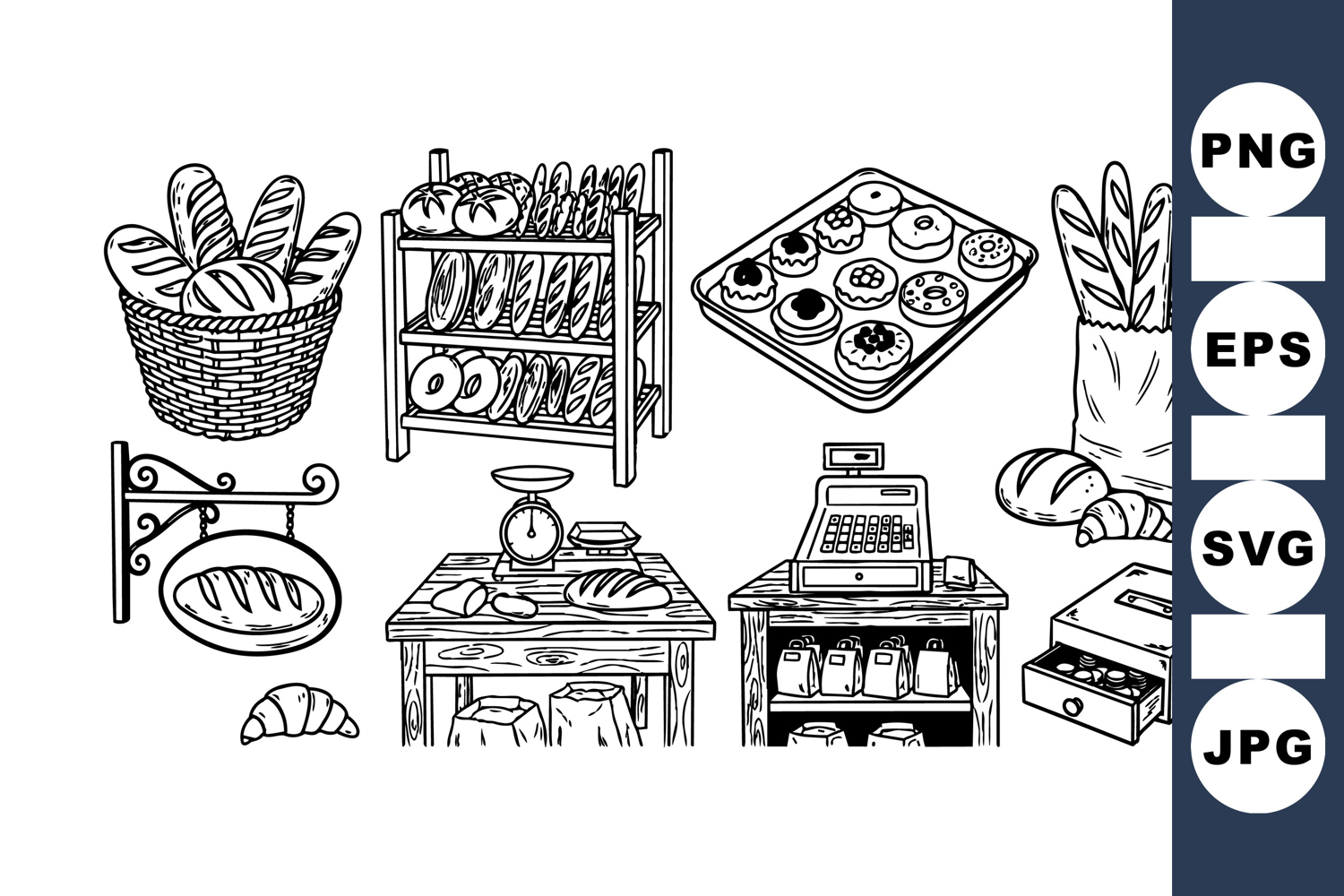 Hand drawn bakery illustration showing bread basket, oven, pastry trays, shelves, cash register, and bread bag in monochrome line art style.