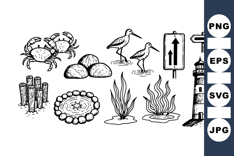 Collection of vintage black and white illustrations showcasing crabs, birds, lighthouse, rocks, seaweed, and coastal elements in a detailed hand drawn style for design or educational use.