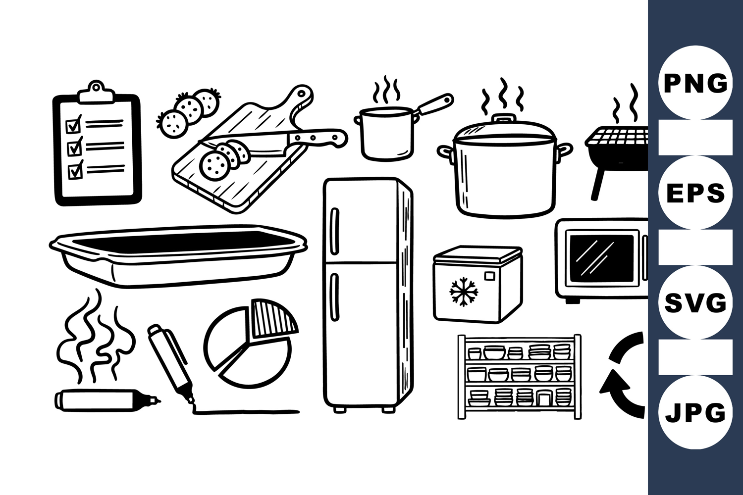 Hand drawn black and white line art collection of kitchen utensils and appliances including pots, microwave, refrigerator, grill, and cutting board, minimalistic style.