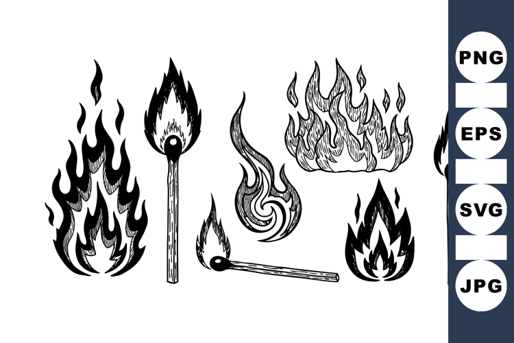 Hand Drawn Flame Vintage Fire Clipart Burning Match Illustration Retro Flame Design Black And White Fire Flame Sketch Bundle Fire Element Graphics Matchstick Clipart Set Old Style Fire Drawing Flame Artwork Collection