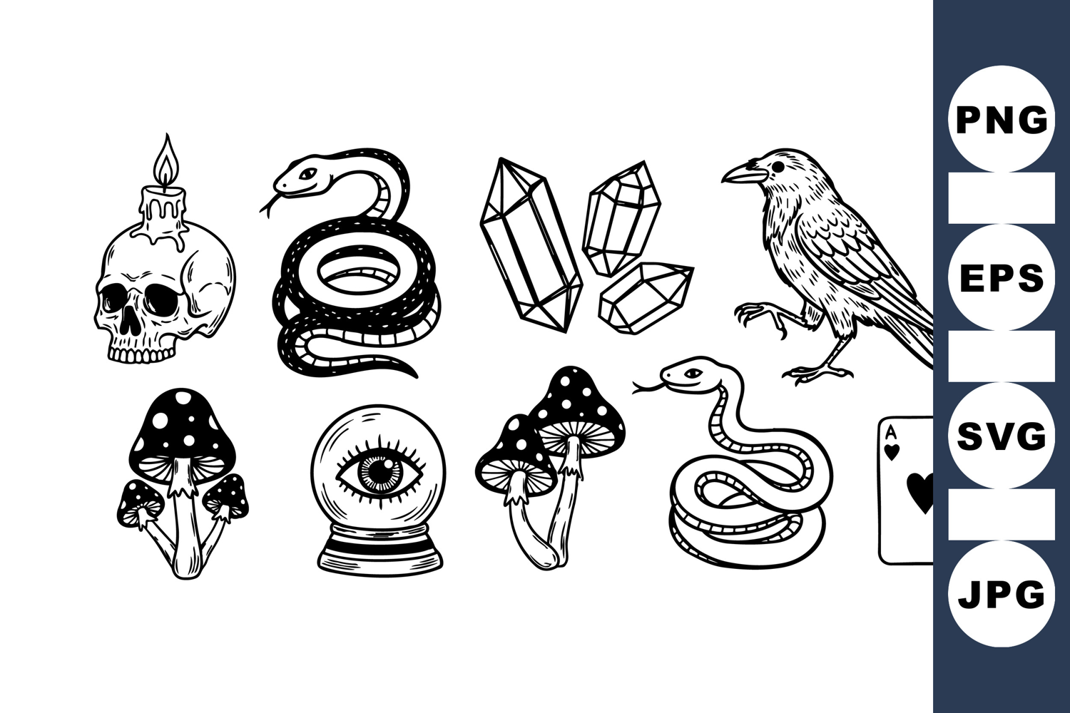 Tarot Card Clipart Crystal Ball Graphic Witchcraft Clipart Set Spooky Craft Bundle Occult Line Art Skull Snake Illustration Crow Crystal Elements Mushroom Magic Bundle Gothic Printables Pack Mystical Vector Set